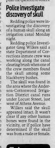 In March 2013, the skeletal remains of an unknown individual were found in Redding, California. Partial skeletal remains were found among blackberry bushes near the Anderson-Cottonwood Irrigation District Canal by a crew of brush cutting workers. Law enforcement, including the Redding Police Department and the Shasta County Sheriff's Office, responded to the scene and launched a days-long search to investigate the area, but did not find any information that could identify the person.