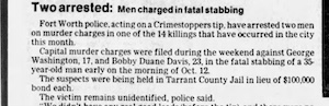On October 12, 1985, a Black male was attacked outside of Dave's Liquor Store located at 650 East Hattie Street in Fort Worth, Texas. Two men approached the man, stealing his wallet and stabbing him in the right side of his chest. Several law enforcement agencies responded, including the Fort Worth Police Department and the Tarrant County Medical Examiner's Office and began investigating the case as a homicide. The victim was rushed to a nearby hospital where he succumbed to his injuries during surgery.